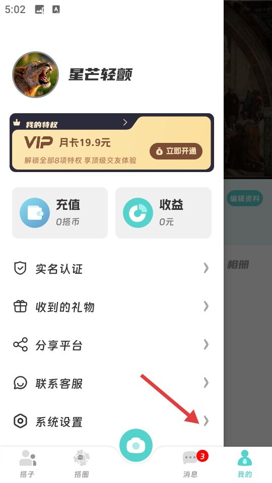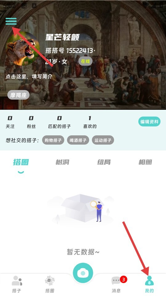 1、首先进入应用,接着进入【我的】页面,然后点击左上角的菜单按钮。