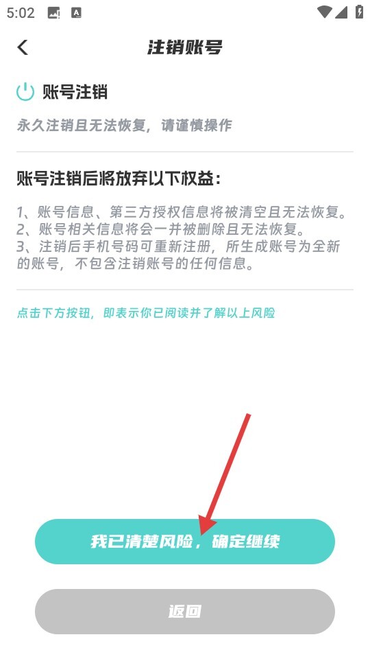 4、进入账号注销页面后,请仔细阅读页面上关于账号注销的风险提示内容。若您已确认要注销账号,点击【我已清楚风险,确定继续】按钮即可。