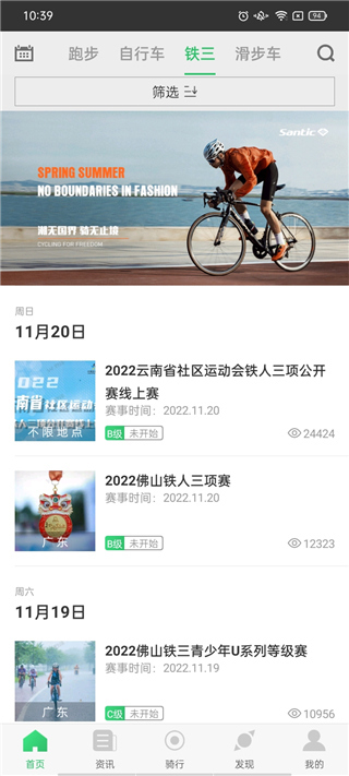 进入软件首页后,能看到跑步、自行车、铁三、滑步车、资讯、骑行、发现、我的这些选项。