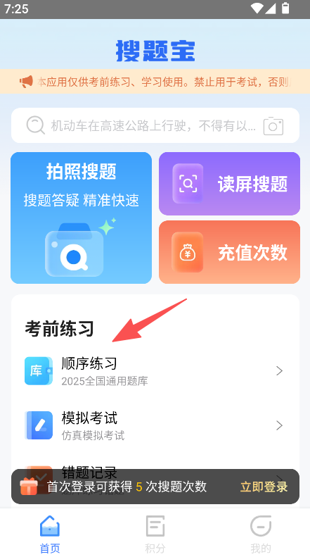 1. 开启考前练习,挑选顺序练习模式,着手进行做题训练。