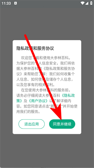 1、打开大参林百科,在弹出的窗口中点击同意并继续,随后进入登录方式选择界面。