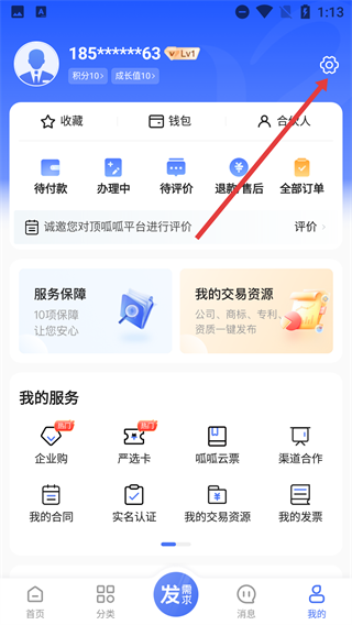 2、进入个人页面后,点击右上角的【设置】图标,即可进入设置界面,在此可以对账户及服务相关的配置项和功能进行管理。
