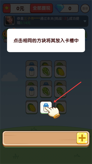 1、在游戏里点击样式相同的方块,把它们移入卡槽中,以此完成方块匹配的基础操作。