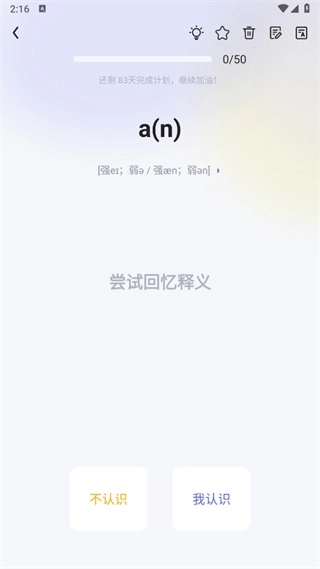 3、最后点击进入背词页面后,我们会看到两个选项:【认识】和【不认识】。