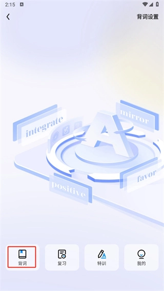 2、接着在该页面找到背词、复习、特训、我的这几个选项,此时我们点击【背词】按钮。