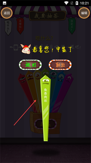 4、抽签完成后会展示中签结果,例如“鱼香肉丝”,此时可选择“放回”签或“取出”签,以便进行再次抽签或确认所选内容。