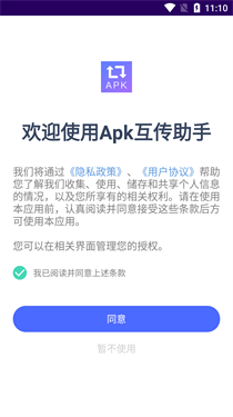 1、在本站并打开Apk互传助手,点击同意