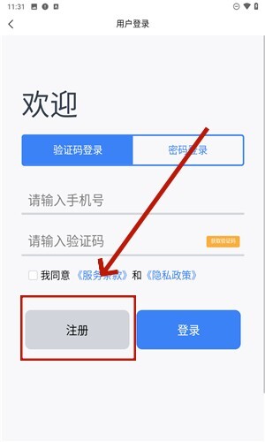 3、完成选择后,即可进入注册登录页面,随后点击页面左下方的“注册”按钮。