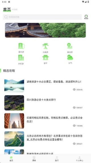 1、首页上新了大量精选攻略,同时还提供国内游、出境游、周边游、乡村游、景区查询、天气查询等功能。