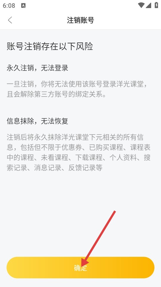 4、在注销账号的风险提示页面,点击【确定】按钮,即可完成账号注销操作。