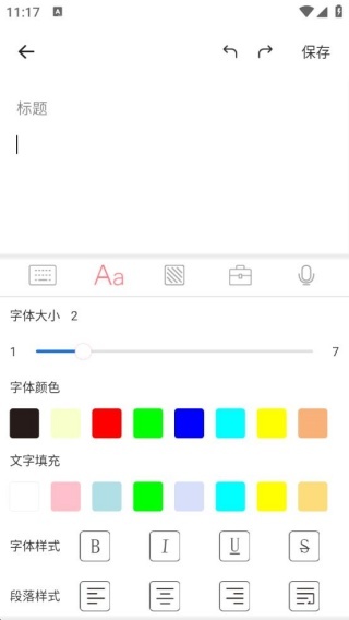 3、添加笔记的界面设计简洁明了,支持字体大小、颜色、字体样式、段落样式等多项设置,并且能够插入不同类型的背景。
