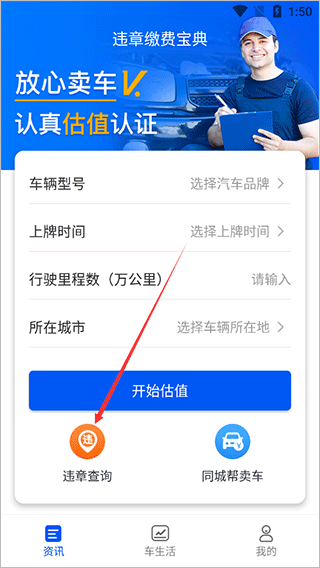 1、打开违章缴费宝典后,在资讯页面我们可以找到“违章查询”功能,还能对二手车进行估价;