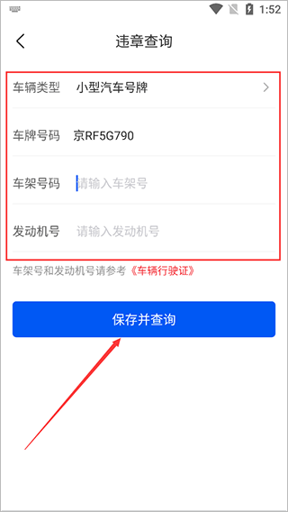 2、接着选择自己需要查询的车型,填写车牌号、车架号和发动机号,若不清楚车架号和发动机号,可在行驶证上查找,填写完毕后点击“保存并查询”按钮即可。