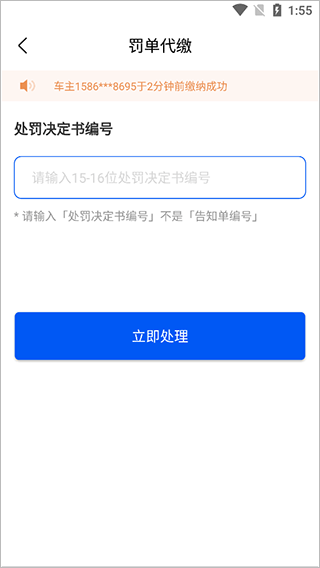 3、此外,软件中还提供“罚单代缴”服务,只需输入处罚决定书编号,就能马上处理罚单。