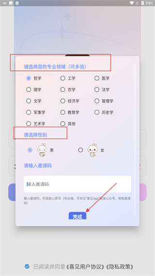 1、挑选【专业领域】和【性别】,非必填项处能填写邀请码,勾选协议后点击【完成】按钮,完成信息填写即可进入应用。