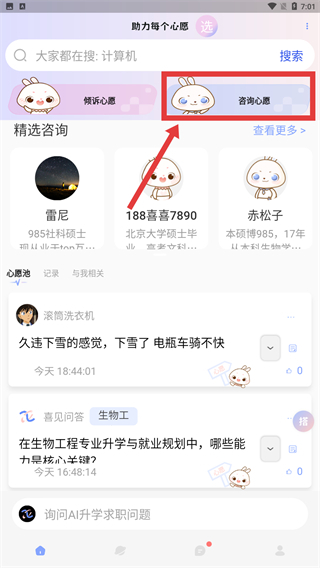 2、在首页切换到【咨询心愿】板块,就能看到精选的咨询顾问列表,获取升学求职方面的咨询资源。
