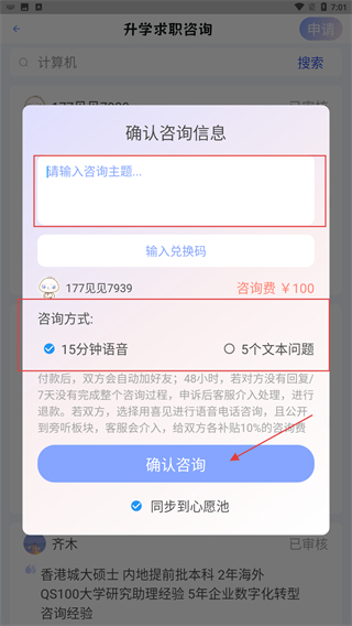 4、在【确认咨询信息】环节,输入【咨询主题】,选定咨询方式后点击【确认咨询】按钮,即可完成咨询的发起流程。