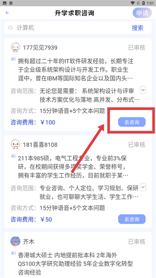3、进入【升学求职咨询】页面,选定对应的顾问后点击【去咨询】按钮,就能发起针对该顾问专业领域的咨询请求。