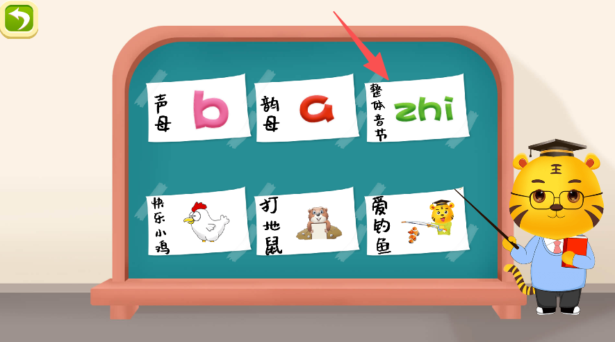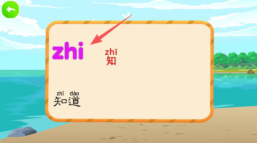 2、在拼音界面,学习声母、韵母以及整体认读音节(比如zhi这类)。