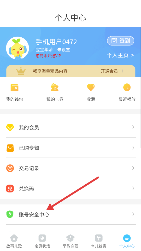 2、进入个人中心页面后,找到并点击【账号安全中心】选项,即可进入对应的账号安全中心页面。