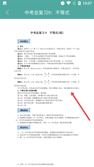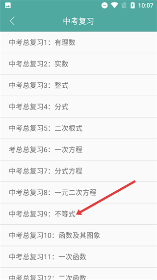 3、在【中考复习】的知识点列表里,找到并点击【中考总复习9:不等式】这一选项,即可进入该知识点对应的学习页面。