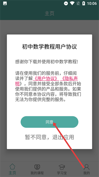 1、仔细阅读《初中数学教程用户协议》与《隐私声明》,在充分了解相关条款内容后,点击【同意】按钮,就能使用本应用提供的课程服务了。
