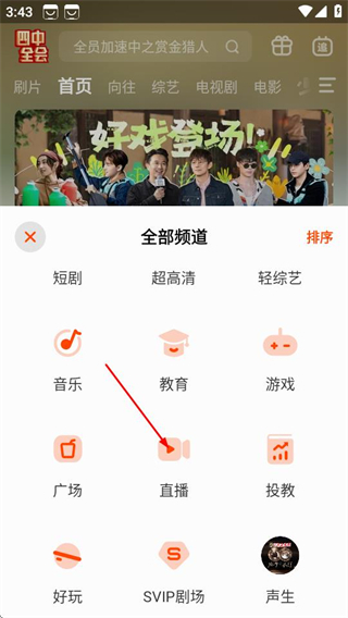 2、在全频道页面,点击直播选项,进入直播专区页面。