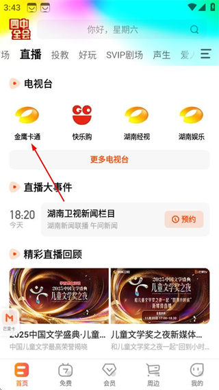 在直播专区里,你可以挑选像金鹰卡通这类感兴趣的电视台,点击就能进入。