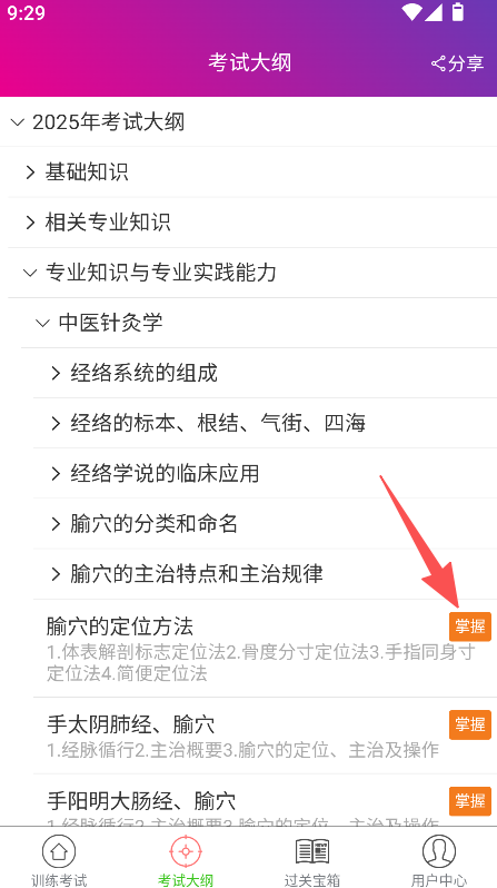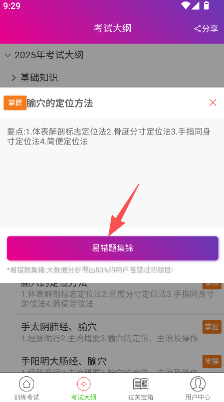 《中医针灸学主治医师》这款软件专为该考试备考打造,内含2025年考试大纲,按基础知识、相关专业知识等板块分类呈现,大纲里还对经络、腧穴等中医针灸学核心内容做了细分,并明确标注了掌握要求;同时配备易错题集锦功能,能结合大纲知识点针对性练习高频错题,帮助考生系统梳理考点、强化薄弱环节,精准适配备考需求。