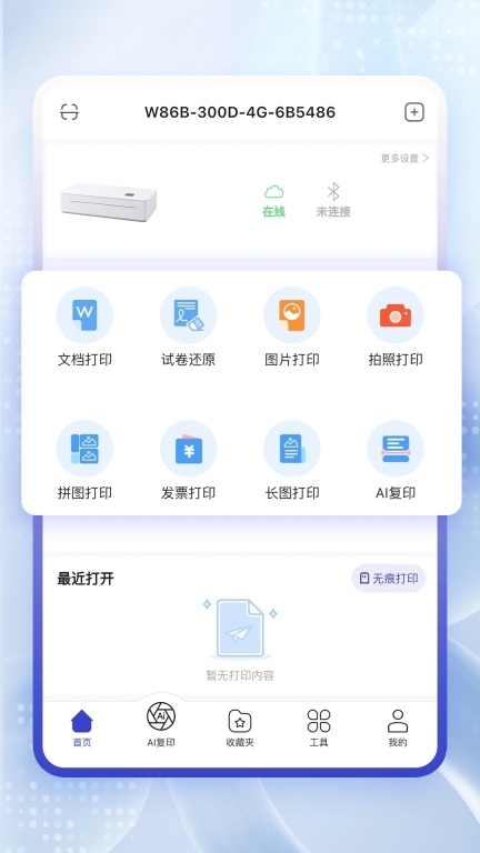 1、支持云打印与蓝牙打印功能,连接稳定且操作便捷,助力用户轻松完成各类文件的输出工作。 2、可兼容多种文档格式进行打印,能够满足办公、学习等不同场景下的多样化需求。