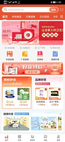 1、首先下载并安装快销网应用,打开后,首页的限时秒杀专区便会映入眼帘,这里有不少优质家庭用品正以特惠价格热卖,各类品牌正品等待你前来选购。