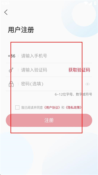 4、进入注册页面后,按要求填写相关信息并勾选协议,之后点击注册按钮,就能完成账号注册流程。