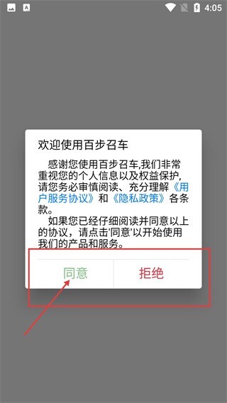 1、初次使用百步召车时,需要阅读并点击【同意】《用户服务协议》与《隐私政策》,方可进入主界面使用相关服务。