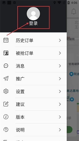3、在展开的菜单里找到并点击【登录】选项,这样就能启动登录流程;完成登录操作后,就可以使用历史订单查询、接单等相关功能了。