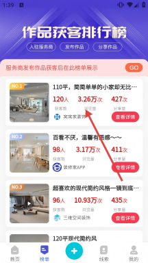在作品获客排行榜里,挑选目标装修案例,点击进入该案例的详情页面。