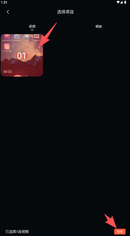 2、在素材页面中,从“视频”分类下挑选至少一段视频,然后点击“完成”按钮。