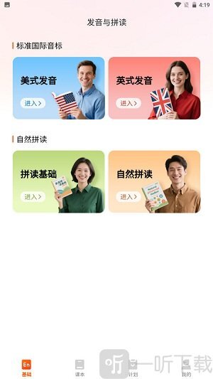 1. 首页包含美式发音、英式发音、拼读基础和自然拼读等功能模块。