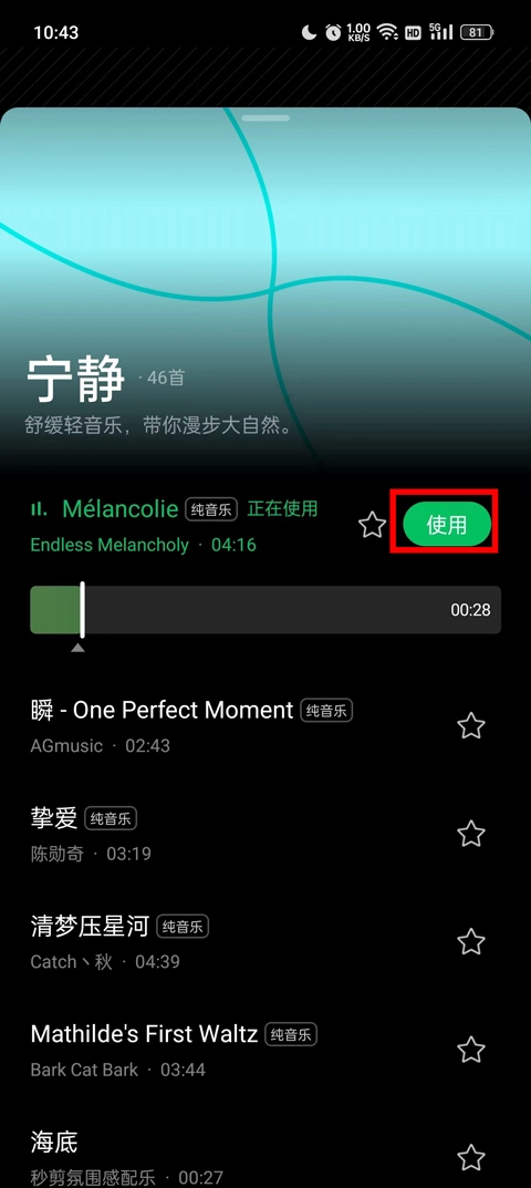 3、依据自身视频的类型来挑选对应的音乐类型,选好后点击“使用”按钮就可以了。