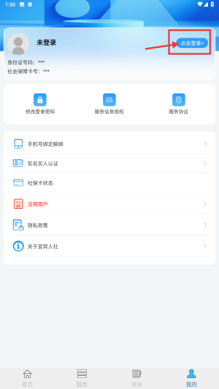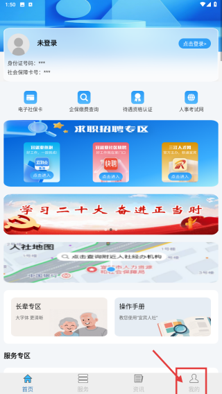 1、打开宜宾人社应用,点击底部导航栏的“我的”选项,进入个人中心页面。