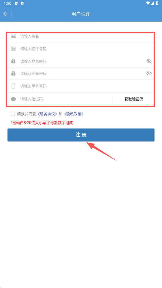 4、用户注册操作的完成步骤为:在注册页面依次填写姓名、证件号码、登录密码,勾选相关协议后点击注册按钮。