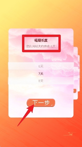 2. 按照提示填写经期长度,也就是选择月经大概持续的天数,接着点击下一步。