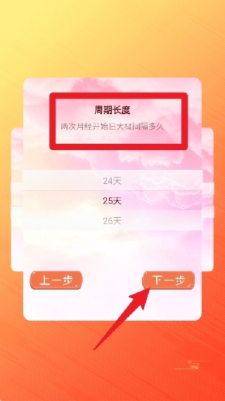 3. 接下来填写周期长度,即两次月经开始日之间大致相隔的天数,然后点击下一步。