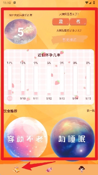 进入首页后,预测的月经时间、近期怀孕几率以及饮食推荐便会直接呈现,助力用户实现科学健康管理。
