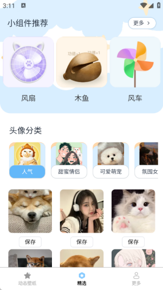 3、精选板块里有不少精彩的头像分类,另外还有风扇、木鱼和风车之类的分类信息;