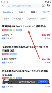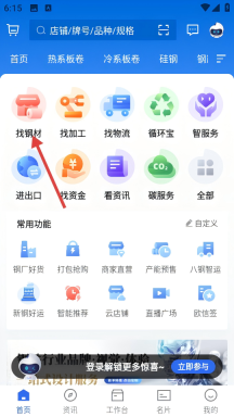 1、在首页点击【找钢材】选项,进入钢材商品列表页面,从而启动钢材采购的筛选流程。