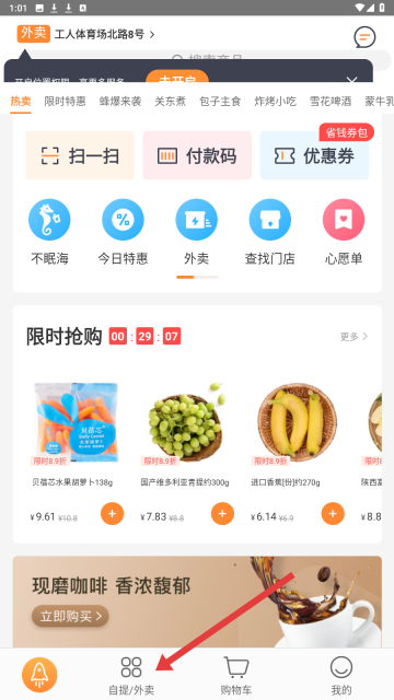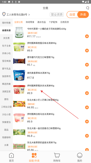 1、点击【自提/外卖】选项,进入商品分类页面,根据自身需求选择零食、饮品等商品类别。