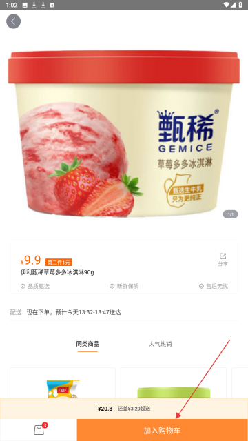 3、点击【加入购物车】按钮,把【伊利甄稀草莓多多冰淇淋】添加至购物车中。
