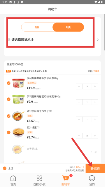 4、选择【外卖】选项,填写收货地址,点击【去结算】按钮,完成购物车商品的结算并提交订单。