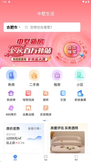 2、首页上展示了新房、二手房、租房等各类房源信息,能让大家更便捷地进行选择。