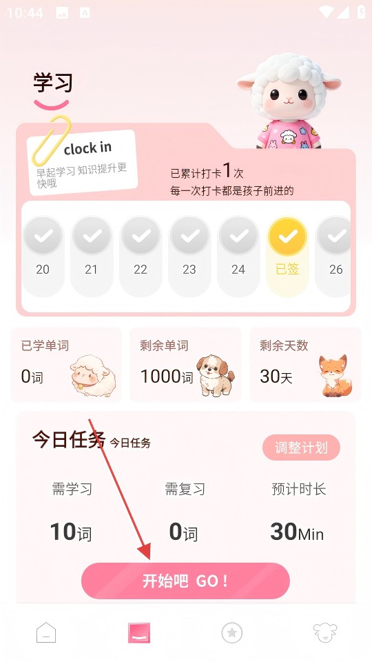 3、在学习页面点击【开始吧GO!】按钮,即可进入初级核心词汇的学习页面。